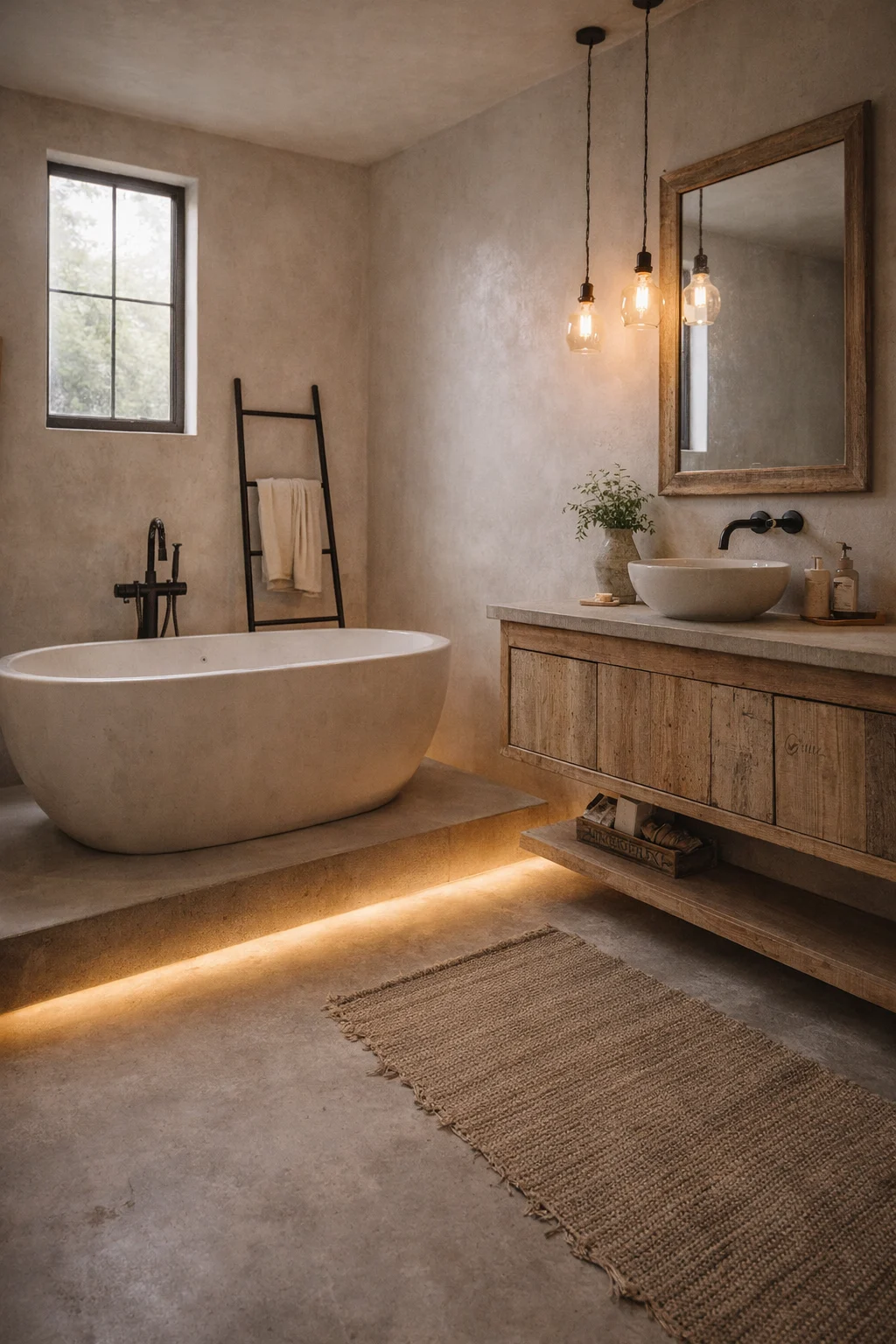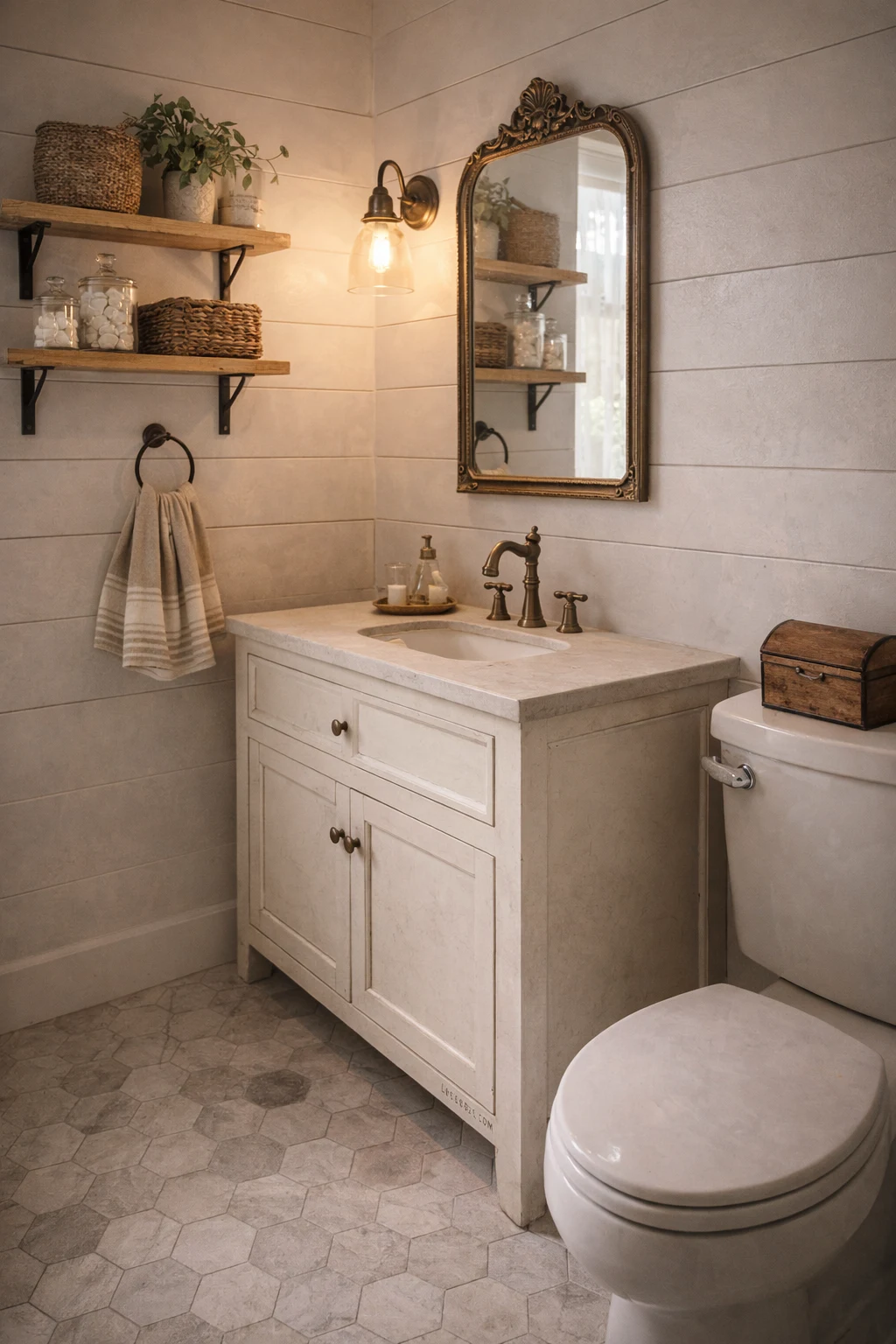 - Introduce one warm wood element — a vanity, a stool, or open shelving