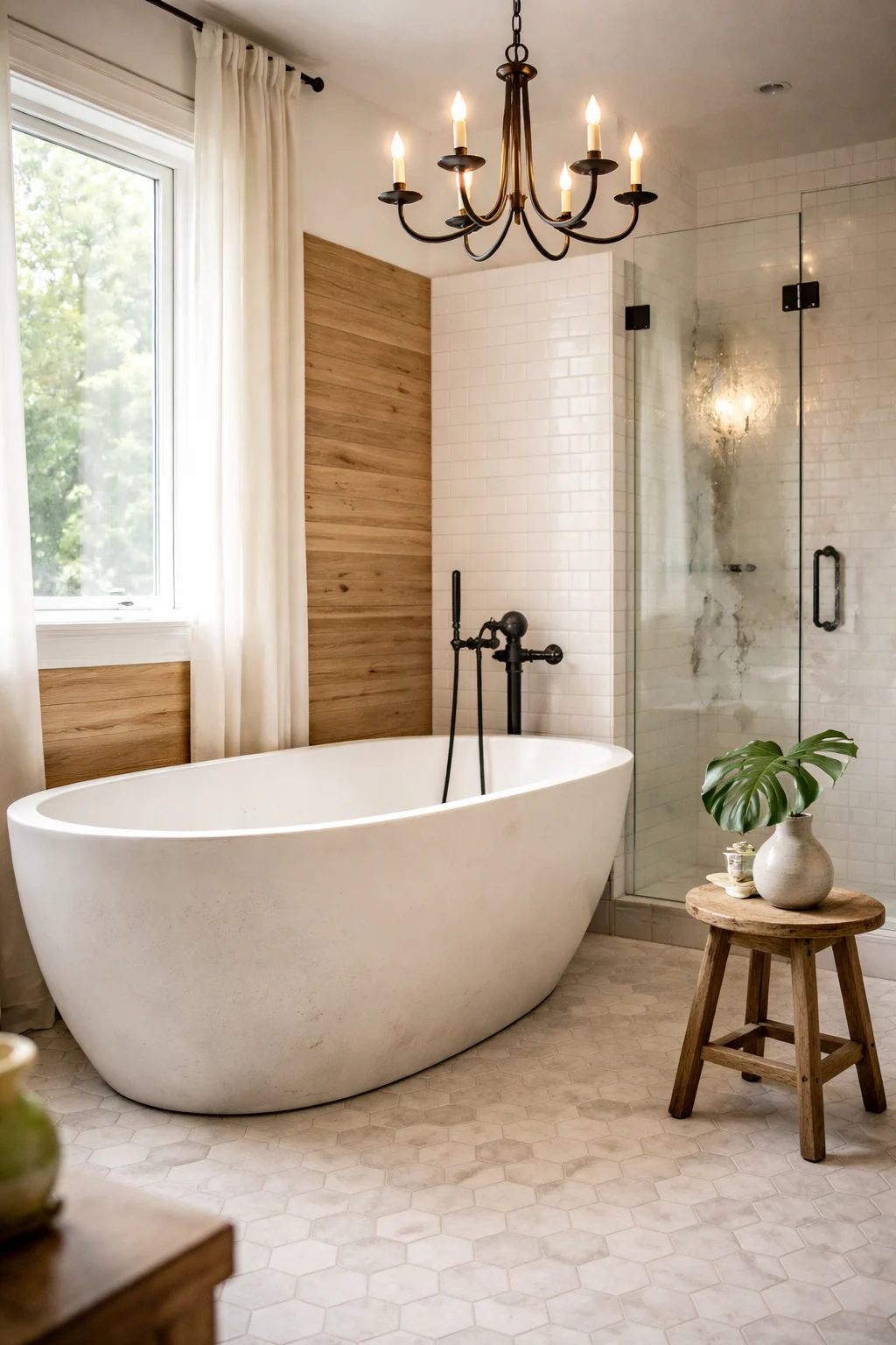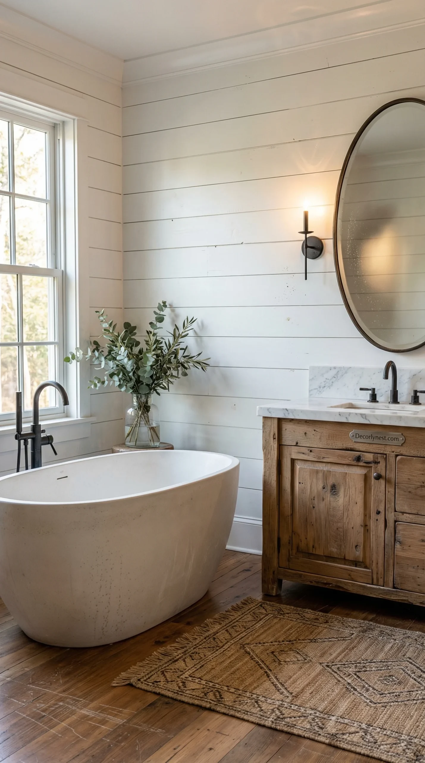 Simple shiplap walls let the tub’s shape stay the visual anchor. Wood-look flooring or plain hex tile provides ground without competing. Black fixtures — a floor-mounted faucet, simple wall sconces — nod to the hardware without overshadowing the tub itself.