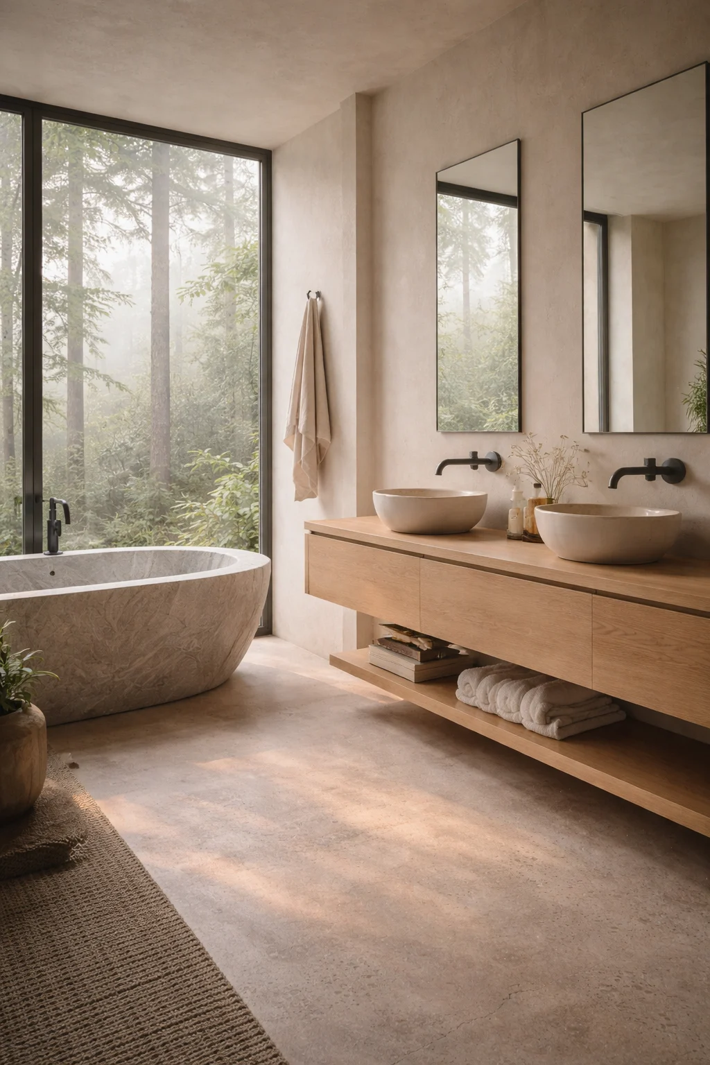 This is why texture is the most underrated tool in a neutral bathroom. You don’t need contrast in color if you have enough contrast in surface quality. Matte versus glossy. Rough versus smooth. Natural versus manufactured.