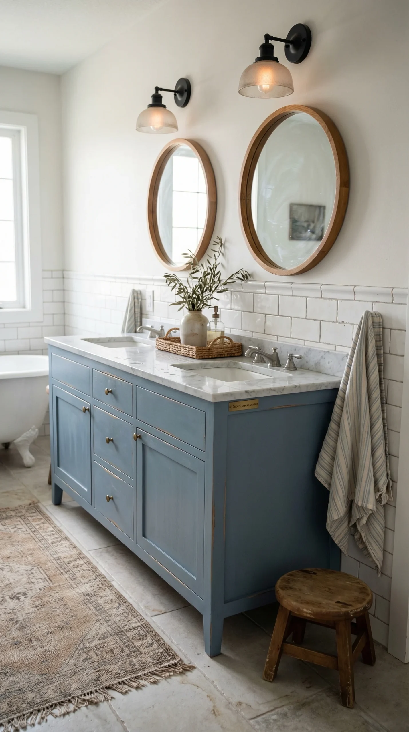 If you’re only going to invest in one thing in a farmhouse bathroom, make it the vanity. A strong vanity can carry an entire room — it sets the tone, anchors the palette, and tells you exactly what kind of bathroom you’re in before you even look at the walls.