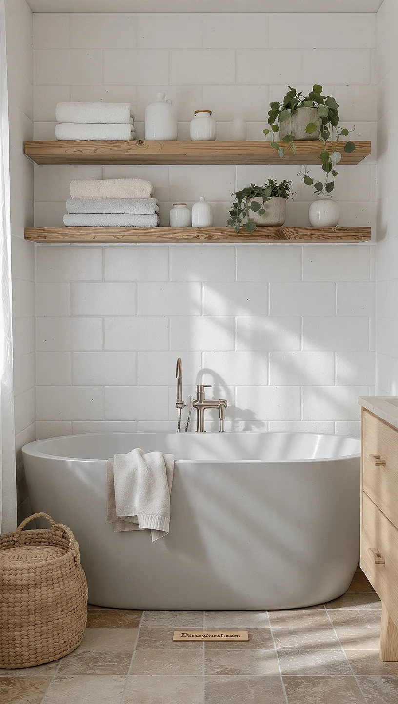 Wood accents are especially effective in white bathrooms. Even a single wooden element — a stool, a shelf, a small mirror frame — brings a warmth that no amount of white-on-white layering can replicate.