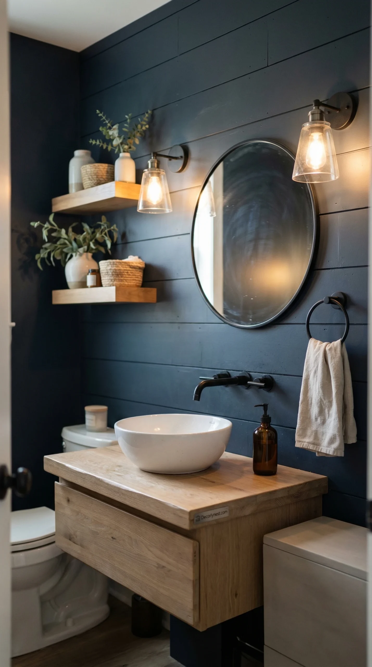 The key to making it work is contrast and light management. White wainscoting or shiplap running along the lower third of the wall stops the dark paint from feeling oppressive. A wood vanity in a warm honey or walnut tone pulls the eye away from the walls. And warm lighting — not cool white LEDs, but soft warm bulbs — prevents the room from reading like a cave.