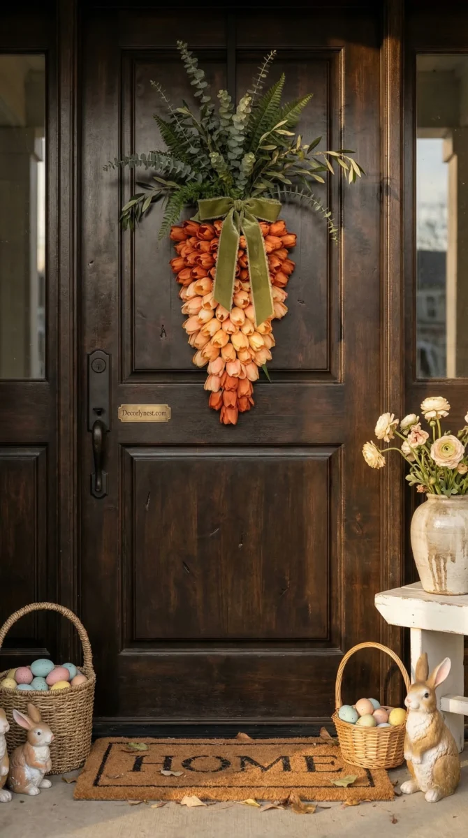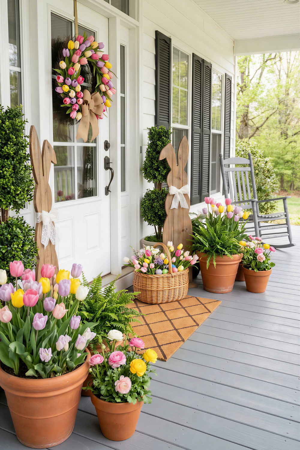 This one has a completely different energy than the last one, which is why it’s worth including. Wooden bunny cutouts, terracotta pots, woven baskets, and tulips in many containers make it warm, casual, and truly charming without trying to be fancy.
