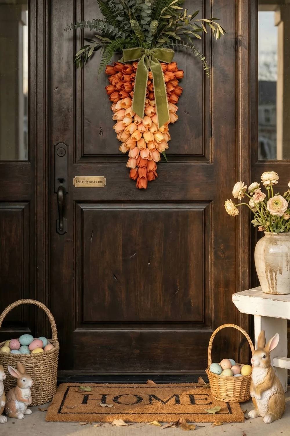 People stop when they see this. Greenery running vertically, orange tulips gathered at the base of a big carrot swag on a dark door. There’s only one thing vying for your attention, which is why it works so well even though it shouldn’t.