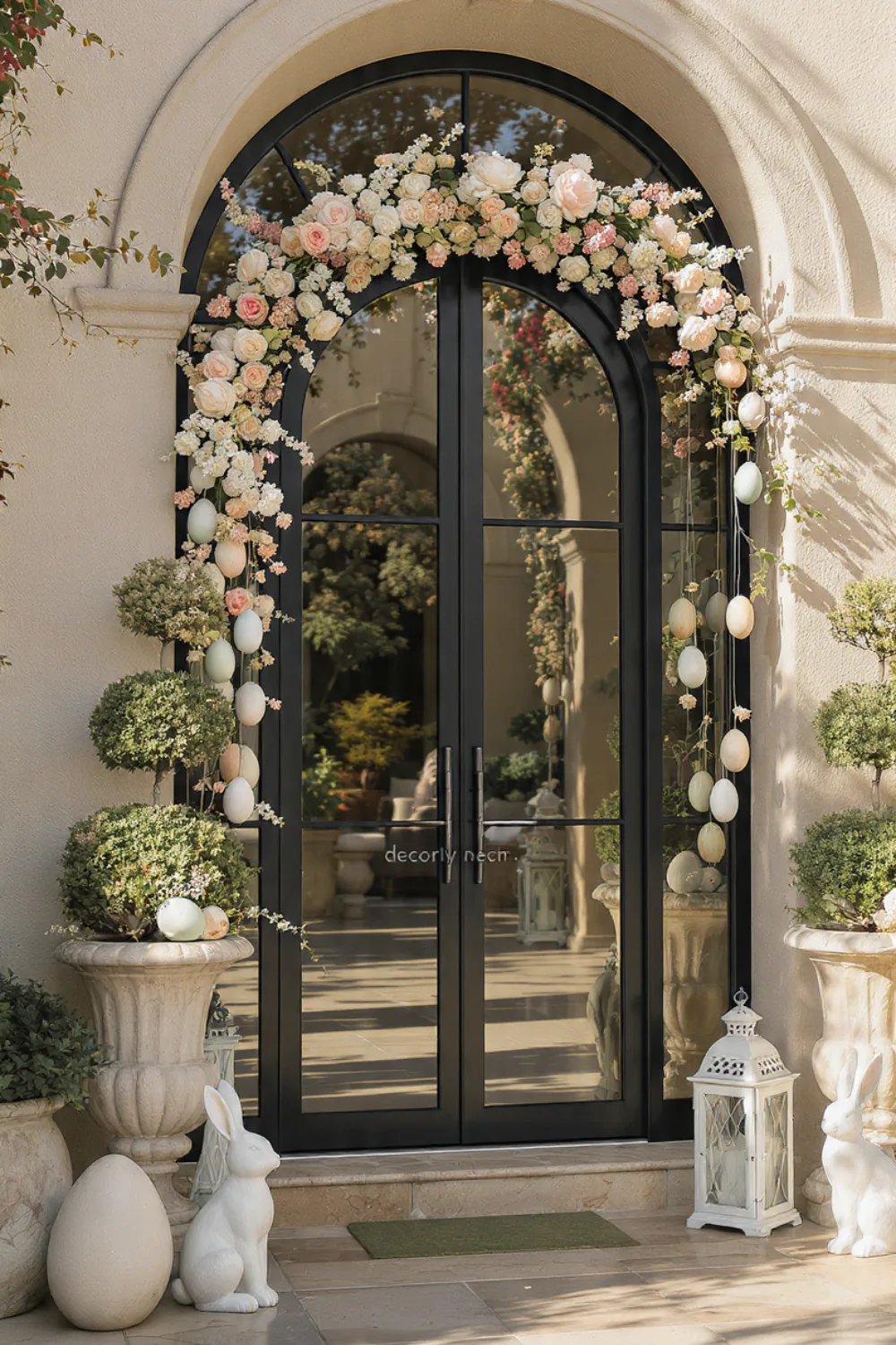 The architecture is doing significant work here — an arched doorway already has inherent drama, and the decorating approach respects that by staying refined rather than competing with it. Symmetrical topiary trees in pedestal urns, a classic rose and greenery wreath, pastel eggs tucked at the base as the only real Easter signal. That’s it.
