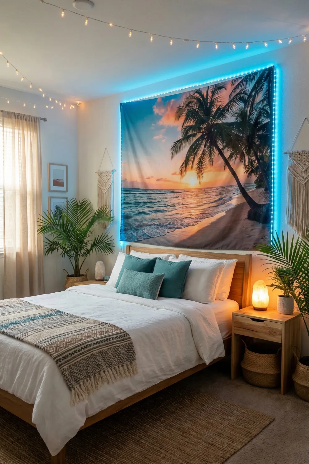 The beach tapestry works as big anchor art, giving the room a seasonal look right away without having to completely change it. The palette discipline is what keeps it from going crazy: sand, aqua, palm green, and warm wood. That is four tones at the most. A limited color palette lets bold decor choices like tropical prints, fairy lights, and woven textures live together in harmony.
