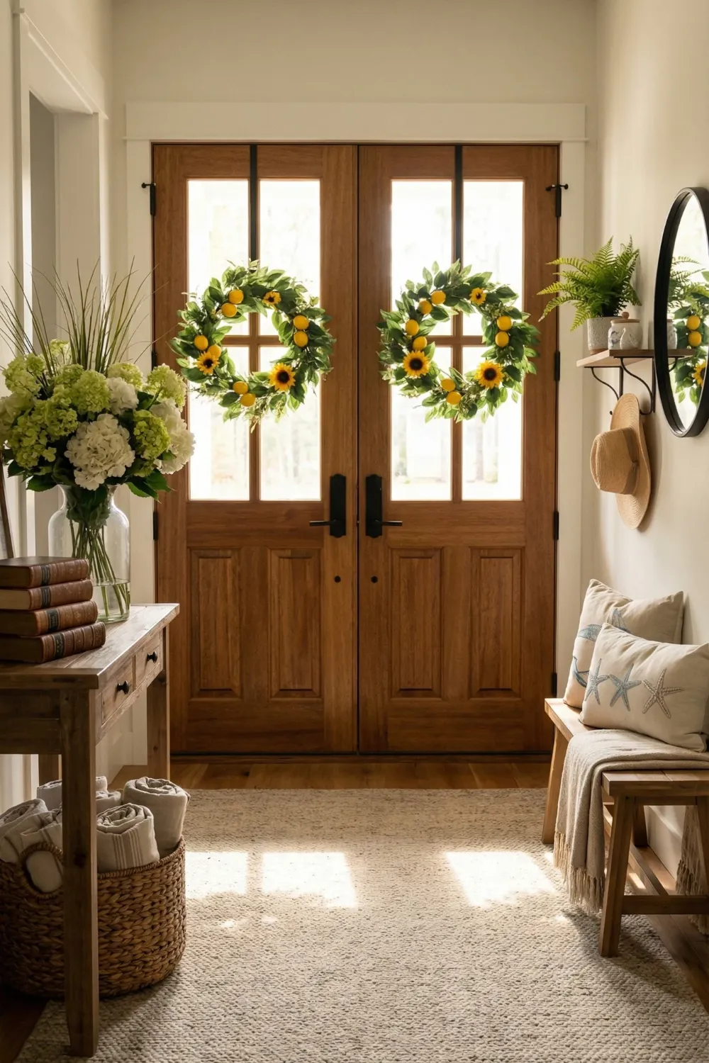 Controlled simplicity is the key to summer entryway style. This is a transitional space by nature, and it is easy to want to decorate it too much. Do not give in. One statement seasonal item, like a wreath, a bold arrangement of sunflowers in a crock, or a vintage mirror with a rope frame, looks much better when it is surrounded by neutral, useful things than six other decorative items.
