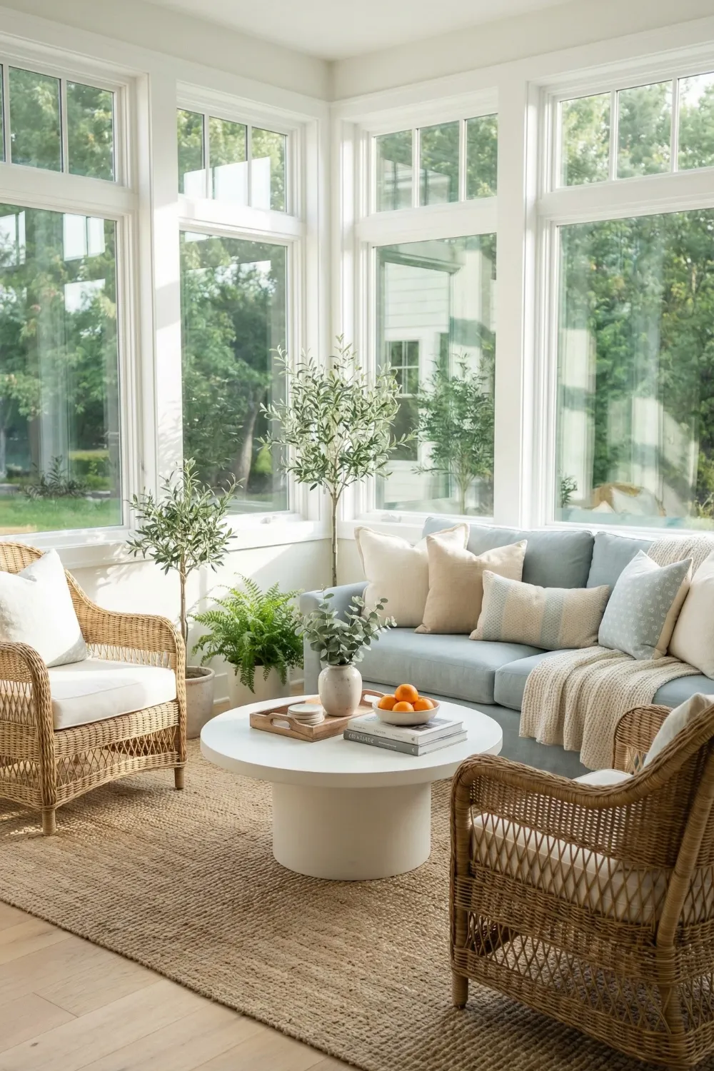 - Natural fiber materials (rattan, jute, woven cotton) add warmth and texture without the visual weight of heavier upholstery — essential for rooms where airiness is the priority