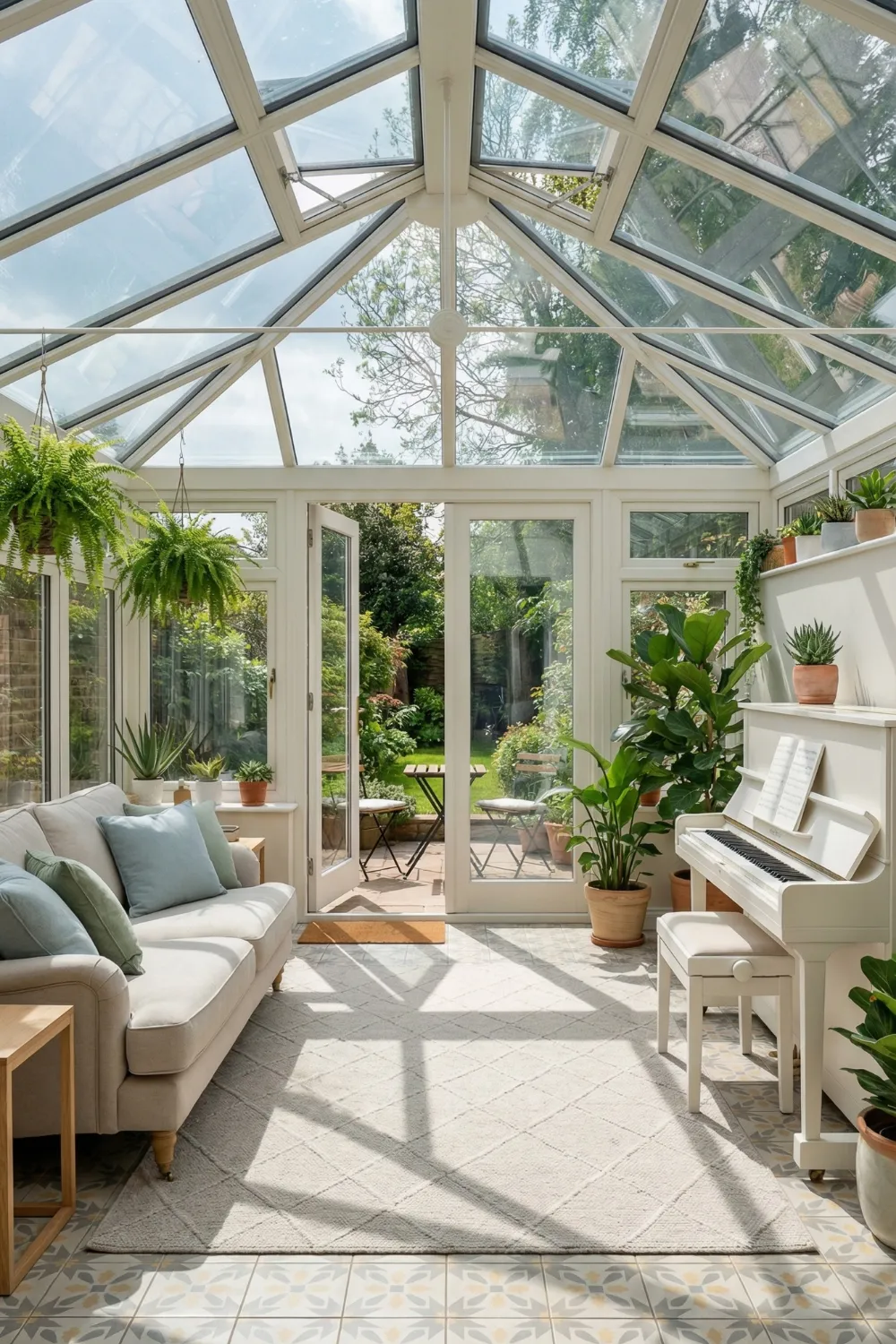 The glass ceiling sunroom is the purest expression of what a sunroom can be when design prioritises light as the dominant material rather than treating it as something to be managed. Daylight moves through the space all day — angle, intensity, and colour shifting continuously from morning cool to afternoon warm to the amber quality of late afternoon that makes every surface look better than it has any right to.