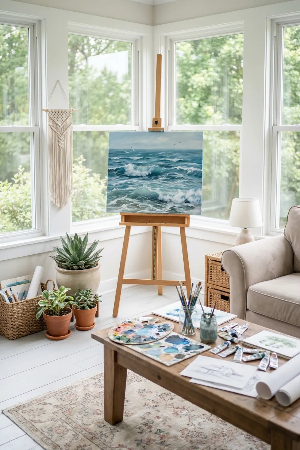 The design principle in a sunroom studio is functional minimalism: every element earns its place by serving the work, and nothing is added for decoration that doesn’t also improve the working conditions. An easel positioned to receive even north or east light. A neutral palette that doesn’t introduce colour bias. Open floor space that allows furniture to be rearranged as projects change. Storage that contains supplies without eliminating them from reach.