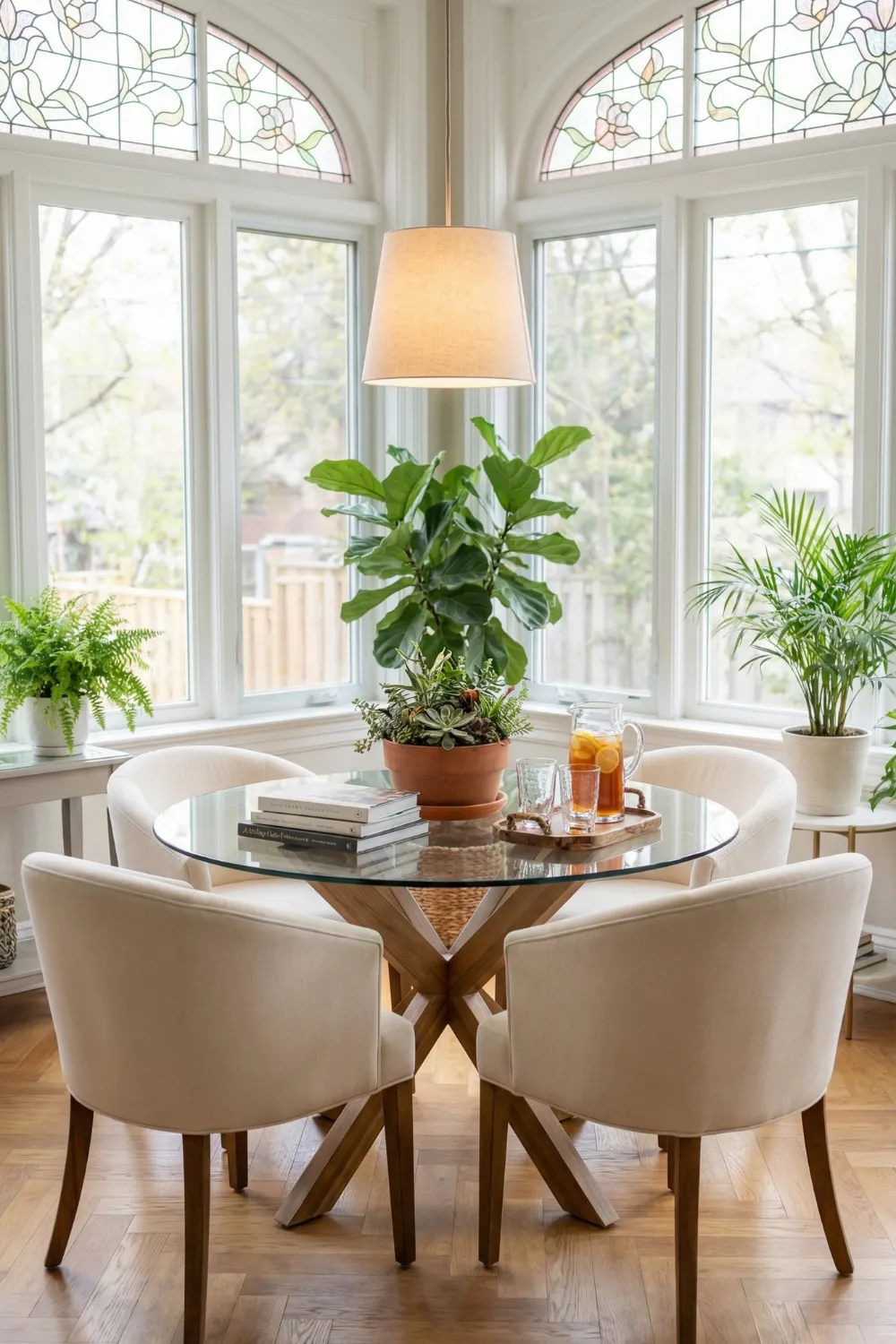 The round table is the central design decision in a sunroom dining setup, and it earns its position. Round tables improve conversation by eliminating the hierarchy of ends and sides. They allow more flexible seating numbers than rectangular tables. And in a glass-walled space, the curved form provides a counterpoint to the rectilinear geometry of the window frames that makes the furniture arrangement feel more naturally comfortable than a rectangular table would.
