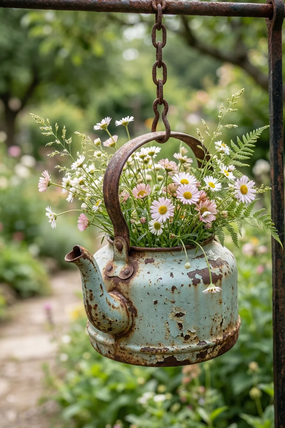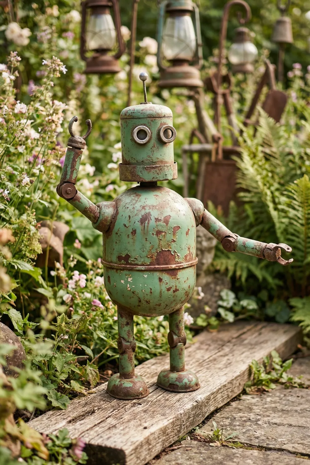 Seek out reclaimed metal pieces, old farm equipment repurposed as sculpture, or handmade yard art from local makers. The imperfections — rust, uneven welds, mismatched parts — are exactly what make these pieces work in a vintage garden context.