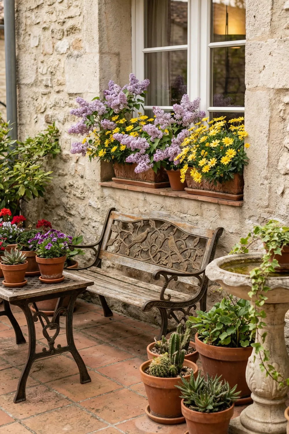 You don’t need a Tuscan villa to achieve that sunlit European courtyard feeling. A stone or terracotta tile patio, one well-chosen iron bench, and a pair of window boxes filled with seasonal blooms will get you surprisingly close.