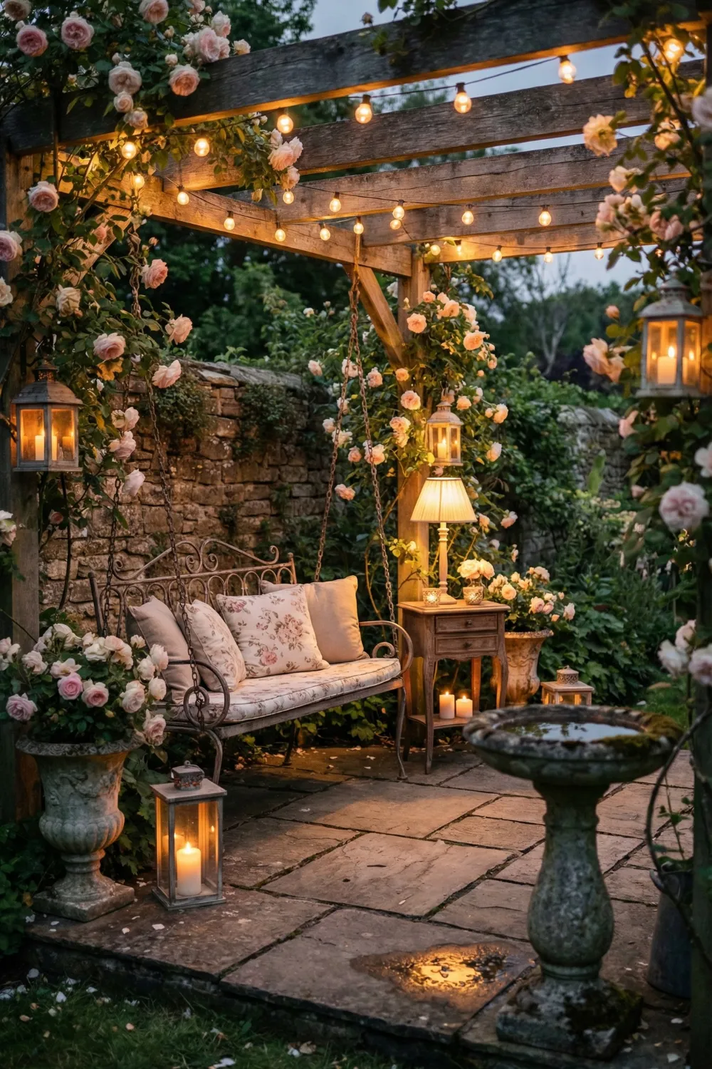Add soft string lights or a hanging lantern for evening use. This is where the transformation from “daytime pretty” to “evening magical” happens.