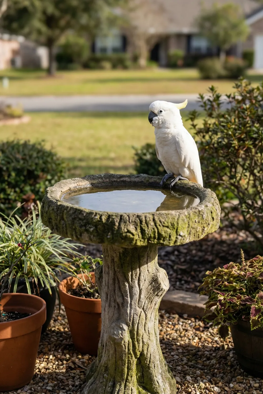 3. Rustic Birdbath as Garden Focal Point — The Statement Necklace Principle