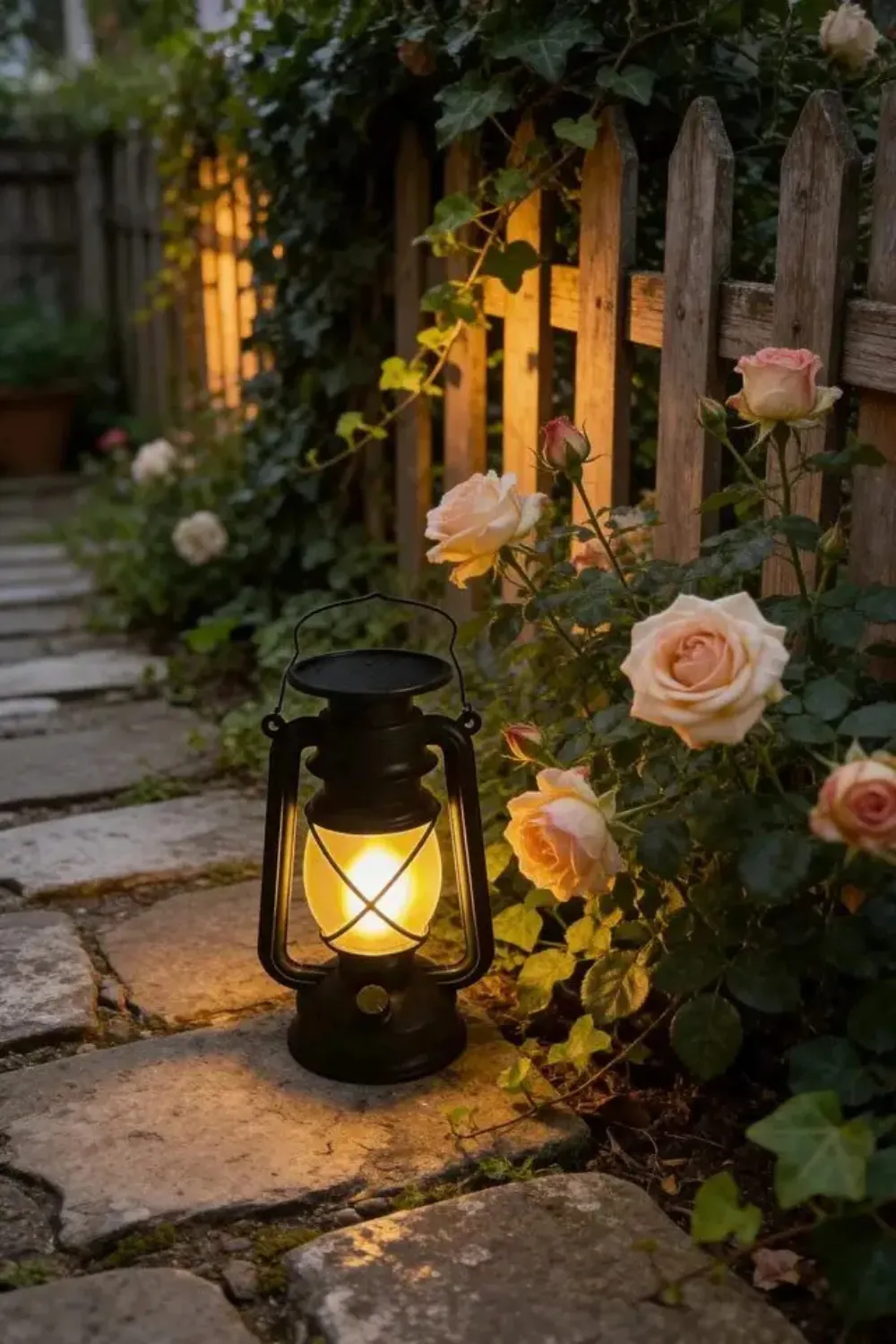 4. Vintage Lanterns Along a Rose Garden Path — Light as a Design Tool