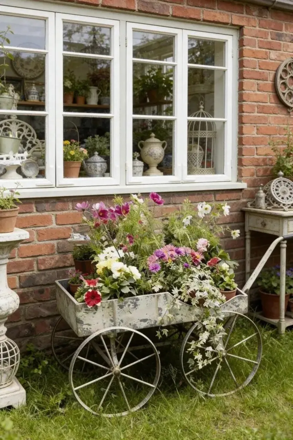 A rusty metal cart or an old wooden wheelbarrow full of flowers is one of the best ways to style a vintage garden. It costs very little, takes only a few minutes to set up, and adds a lot of character.